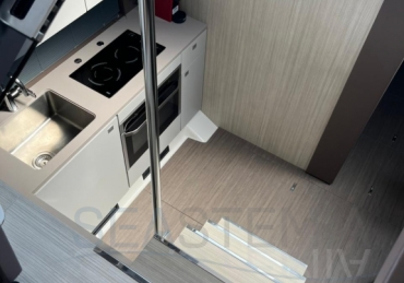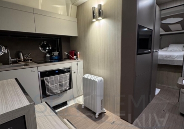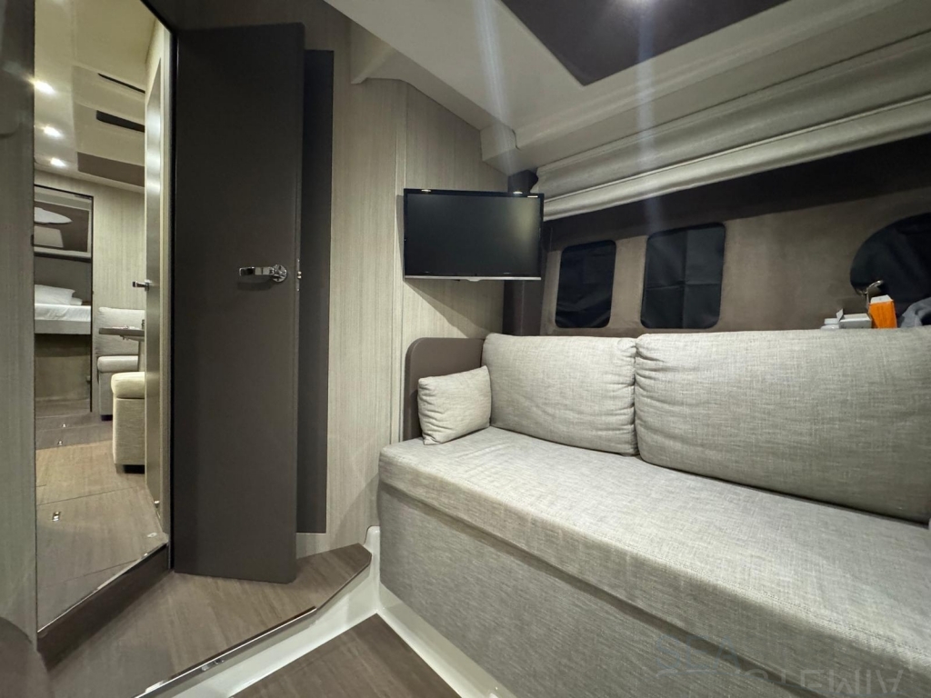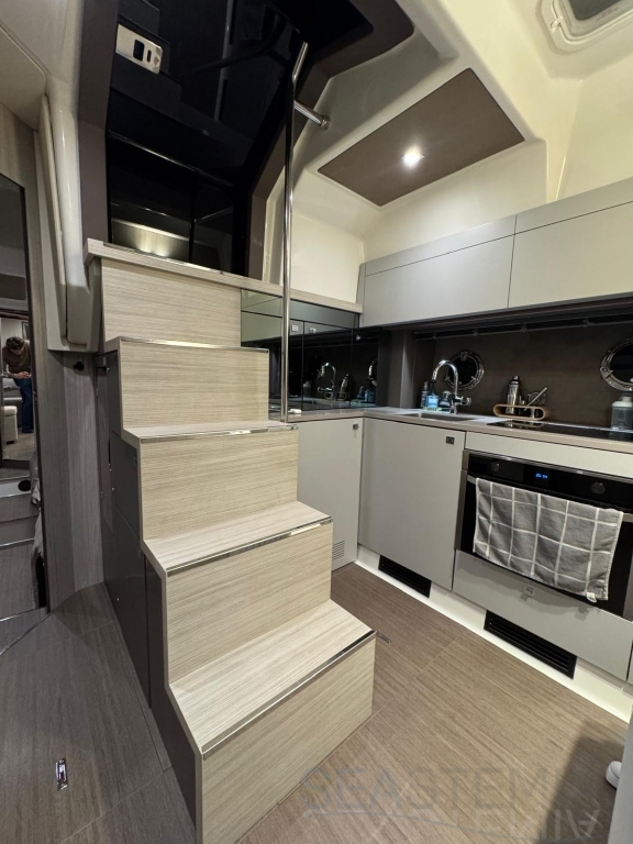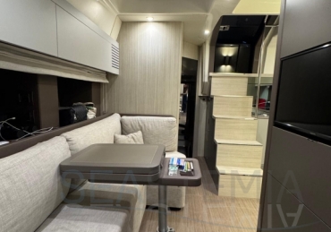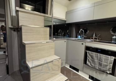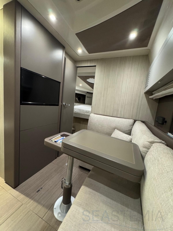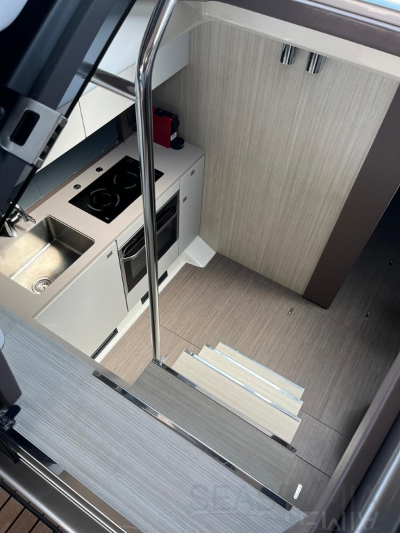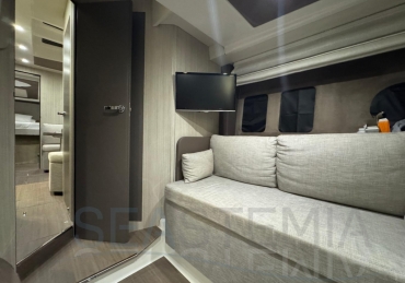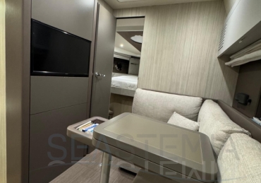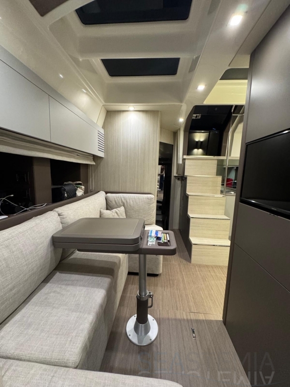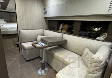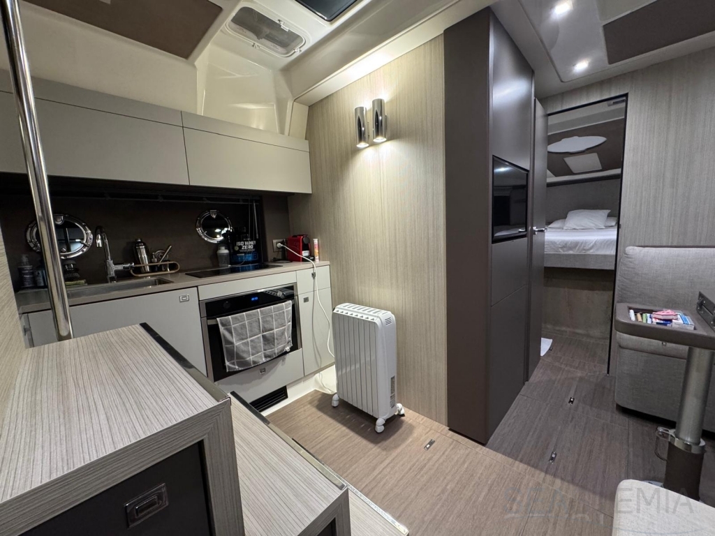 One of its key features is the adjustable soft top, which allows the cockpit to be either fully protected or opened up, offering flexibility and comfort in different conditions. The cockpit layout is practical and well-designed, including a dinette, galley, and relaxation area.