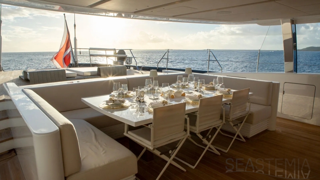 Her top speed is 15.3 kn, her cruising speed is 13.0 kn, and she boasts a maximum cruising range of 5650.0 nm at 12.0 kn, with power coming from a Caterpillar diesel engine. She can accommodate up to 8 guests in 4 staterooms, with 9 crew members waiting on their every need. She has a gross tonnage of 384.0 GT and a 10.2 m beam, and she is built with a Teak deck, a Aluminium hull, and Aluminium superstructure.