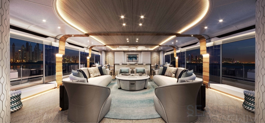 Her opulent exteriors feature an incredibly expansive sun deck, infinity pool, a hybrid beach club, fold-down balconies, and a swim platform providing guests unprecedented ease of access to the water. Her smart layout can accommodate up to 12 guests across its seven lavish staterooms, and can also host a crew of up to nine members with five large crew cabins and private captain’s accommodation.