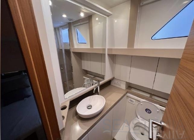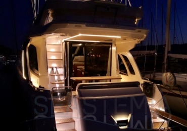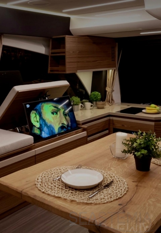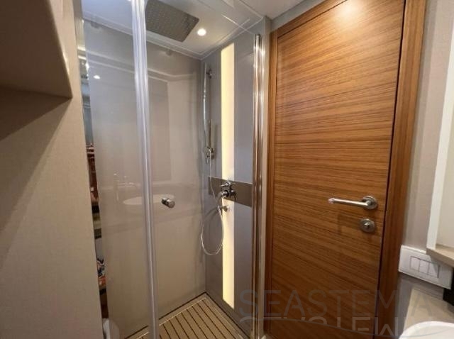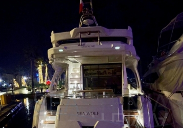 This vessel is exceptionally well equipped, including solar panels, bow and stern thrusters, a Raymarine navigation package, a Fusion audio system with Sony and Samsung TV setup, and a 71,000 BTU reversible air conditioning system. It also features a complete lighting package covering the saloon, cockpit, underwater lights, side decks, and bow, as well as a hydraulic swim platform and a hydraulic passerelle.