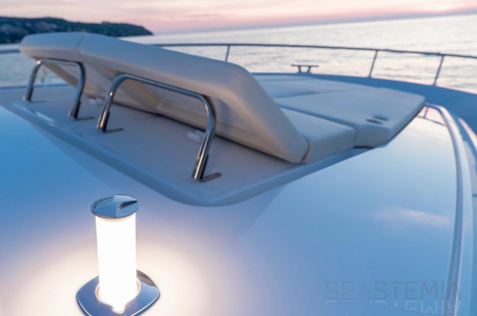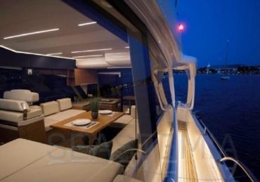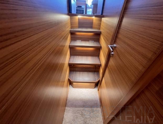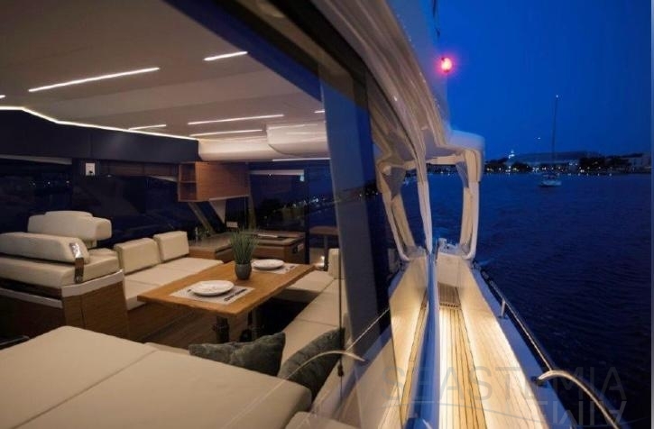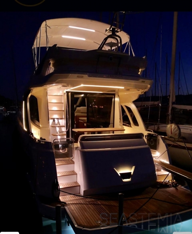 This vessel is exceptionally well equipped, including solar panels, bow and stern thrusters, a Raymarine navigation package, a Fusion audio system with Sony and Samsung TV setup, and a 71,000 BTU reversible air conditioning system. It also features a complete lighting package covering the saloon, cockpit, underwater lights, side decks, and bow, as well as a hydraulic swim platform and a hydraulic passerelle.
